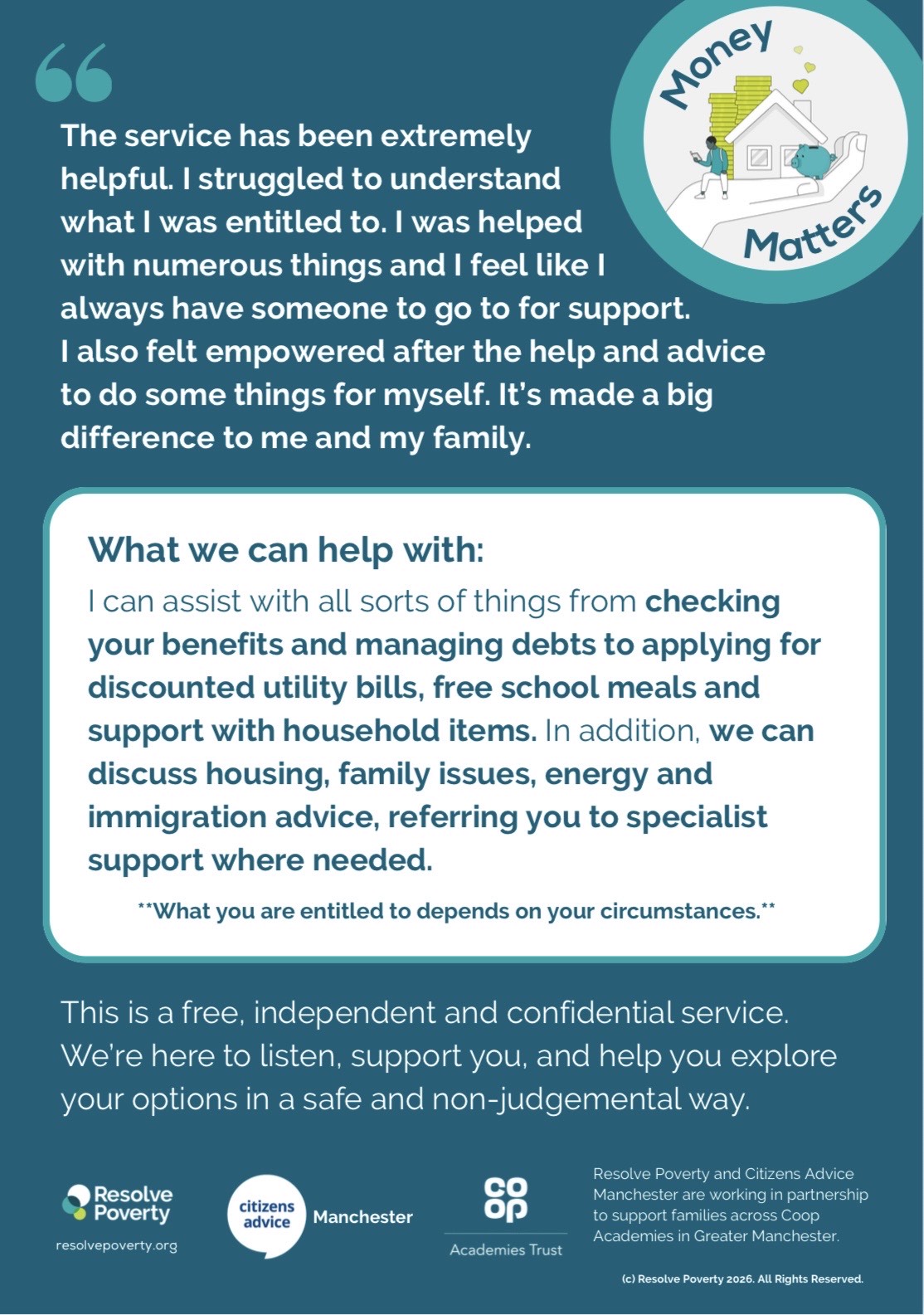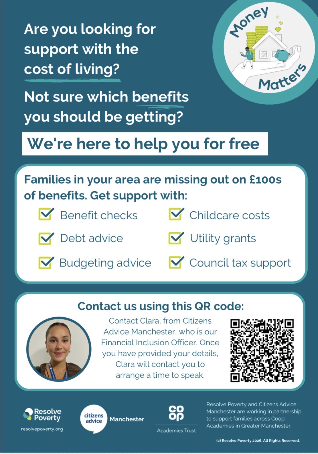 The Co-op Academies’ Community Team is working with Citizen’s Advice to offer a new service. I am proud to announce Co-op Academy Medlock will be one of the first schools to host a Financial Inclusion Officer. Clara will be able to offer advice, support and direction to our families. Please see the images below for further details and to see how you can book an appointment.